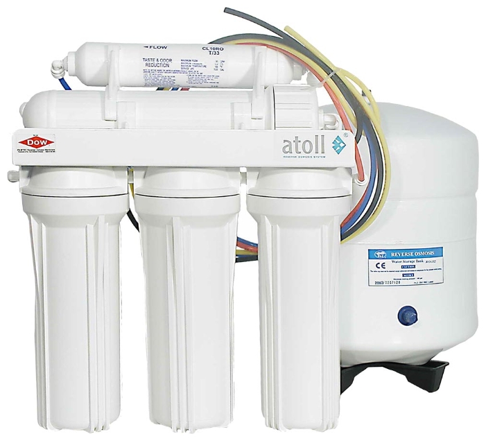 Система обратного осмоса серии Atoll включает в себя постфильтр, префильтры, накопительную емкость, мембрану и питьевой кран.