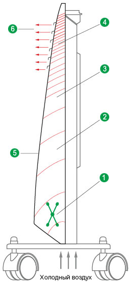Быстрый выход нагретого воздуха через направляющие заслонки специальной формы